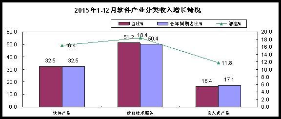 1-12月快报显示,软件产品实现收入14048亿元,同比增长16.4%,增速低于2014年7.1个百分点,比1-11月提高1.2个百分点。其中,信息安全产品增长16.3%,增速比1-11月下调0.2个百分点。信息技术服务实现收入22123亿元,同比增长18.4%,增速比2014年提高1.7个百分点,比1-11月提高0.6个百分点。其中,运营相关服务(包括在线软件运营服务、平台运营服务、基础设施运营服务等在内的信息技术服务)收入增长18.3%;电子商务平台服务(包括在线交易平台服务、在线交易支撑服务在内的信息技术支持服务)收入增长25.1%;集成电路设计实现收入1449亿元,同比增长13.3%;其他信息技术服务(包括信息技术咨询设计服务、系统集成、运维服务、数据服务等)收入增长17.8%。嵌入式系统软件实现收入7077亿元,同比增长11.8%,增速低于2014年18.9个百分点,比1-11月下降1.7个百分点。