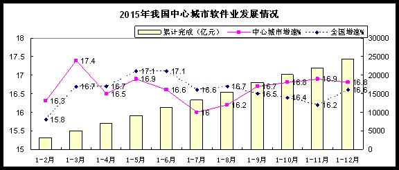 1-12月快报显示,全国15个副省级中心城市实现软件业务收入2.45万亿元,占全国收入的56.6%,同比增长16.8%,高出全国平均水平0.2个百分点,但低于2014年4.7个百分点。其中软件业务收入超过千万元的中心城市达到11个,比2014年新增加2个城市。