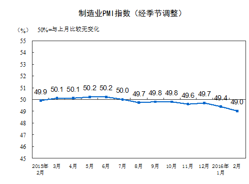2016年2月份,中国制造业采购经理指数(PMI)为49.0%,低于上月0.4个百分点。