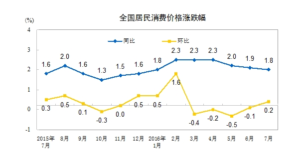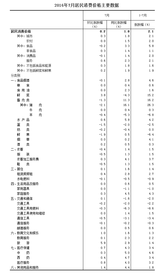 7月份,全国居民消费价格总水平环比上涨0.2%。其中,城市上涨0.3%,农村持平;食品价格下降0.2%,非食品价格上涨0.3%;消费品价格下降0.1%,服务价格上涨0.6%。