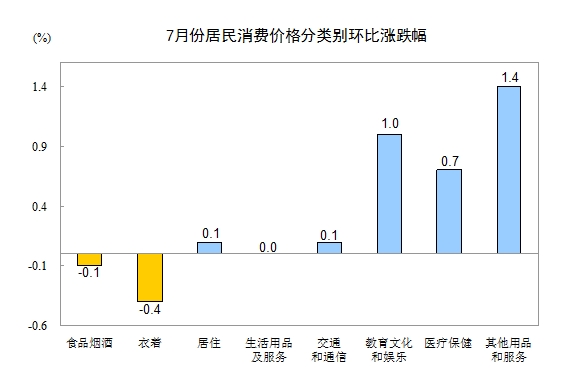 7月份,其他七大类价格环比五涨一降一平。其中,其他用品和服务、教育文化和娱乐、医疗保健、居住、交通和通信价格分别上涨1.4%、1.0%、0.7%、0.1%、0.1%;衣着价格下降0.4%;生活用品及服务价格持平。