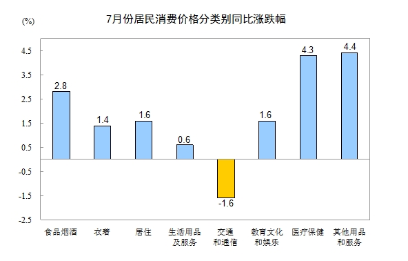 7月份,其他七大类价格同比六涨一降。其中,其他用品和服务、医疗保健、居住、教育文化和娱乐、衣着、生活用品及服务价格分别上涨4.4%、4.3%、1.6%、1.6%、1.4%、0.6%;交通和通信价格下降1.6%。