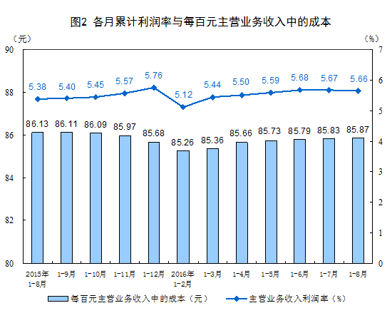1-8月份,规模以上工业企业实现主营业务收入71.7万亿元,同比增长3.6%;发生主营业务成本61.6万亿元,增长3.4%;主营业务收入利润率为5.66%。