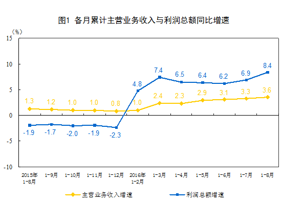 1-8月份,在41个工业大类行业中,33个行业利润总额同比增加,8个减少。主要行业利润情况如下:煤炭开采和洗选业利润总额同比增长15%,农副食品加工业增长9.9%,纺织业增长5.8%,石油加工、炼焦和核燃料加工业增长2.4倍,化学原料和化学制品制造业增长14%,非金属矿物制品业增长9.1%,黑色金属冶炼和压延加工业增长2.1倍,有色金属冶炼和压延加工业增长31.1%,通用设备制造业增长0.6%,专用设备制造业增长7.5%,汽车制造业增长11%,电气机械和器材制造业增长15.1%,计算机、通信和其他电子设备制造业增长19.8%,电力、热力生产和供应业下降3.9%,石油和天然气开采业由同期盈利转为亏损。