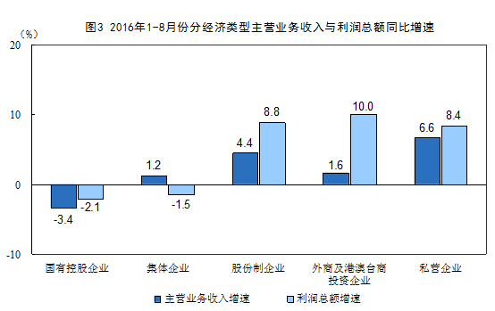 1-8月份,规模以上工业企业中,国有控股企业实现利润总额7461.1亿元,同比下降2.1%;集体企业实现利润总额287.4亿元,下降1.5%;股份制企业实现利润总额27774.4亿元,增长8.8%;外商及港澳台商投资企业实现利润总额10084.8亿元,增长10%;私营企业实现利润总额14316.3亿元,增长8.4%。