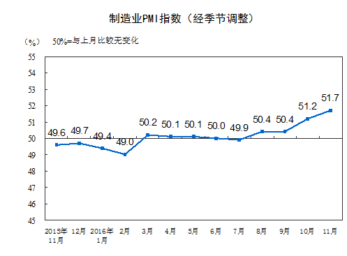2016年11月份,中国制造业采购经理指数(PMI)为51.7%,比上月上升0.5个百分点,延续上行走势。