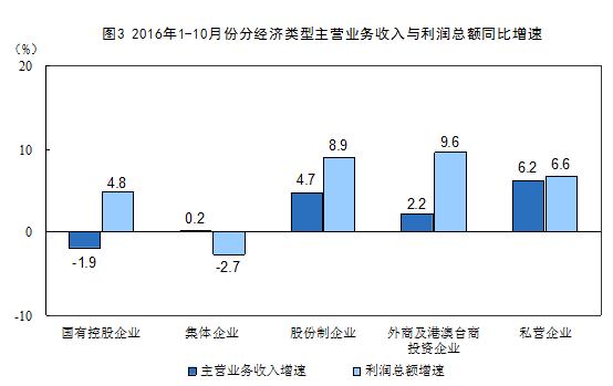 1-10月份,规模以上工业企业中,国有控股企业实现利润总额9577亿元,同比增长4.8%;集体企业实现利润总额375.7亿元,下降2.7%;股份制企业实现利润总额36010.7亿元,增长8.9%;外商及港澳台商投资企业实现利润总额13033.3亿元,增长9.6%;私营企业实现利润总额18545.5亿元,增长6.6%。