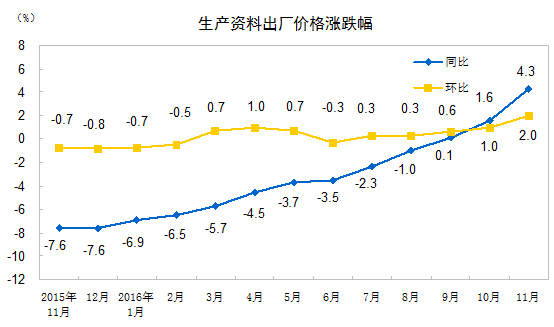 据测算,在11月份3.3%的全国工业生产者出厂价格总水平同比涨幅中,去年价格变动的翘尾因素约为-0.6个百分点,新涨价因素约为3.9个百分点。
