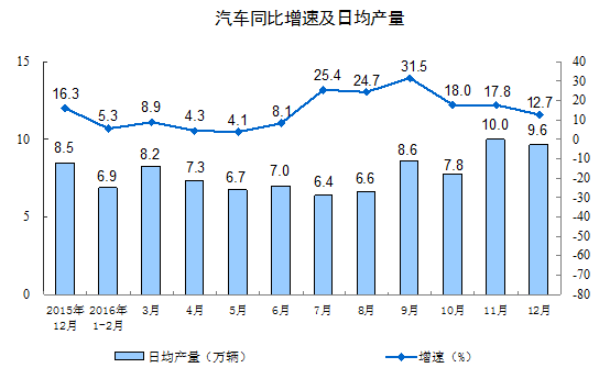 分行业看,12月份,41个大类行业中有33个行业增加值保持同比增长。其中,农副食品加工业增长5.7%,纺织业增长2.2%,化学原料和化学制品制造业增长3.1%,非金属矿物制品业增长4.7%,黑色金属冶炼和压延加工业下降13.1%,有色金属冶炼和压延加工业下降0.8%,通用设备制造业增长8.4%,专用设备制造业增长8.0%,汽车制造业增长16.2%,铁路、船舶、航空航天和其他运输设备制造业下降1.9%,电气机械和器材制造业增长7.2%,计算机、通信和其他电子设备制造业增长13.5%,电力、热力生产和供应业增长7.7%。