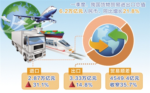 对于一季度外贸增速的“超预期”,海关总署新闻发言人黄颂平表示,一个直接原因就是大宗商品价格的上涨。据统计,一季度,我国铁矿砂、原油等大宗商品进口量价齐升,其中铁矿砂、原油进口均价涨幅分别高达80.5%、64.7%。