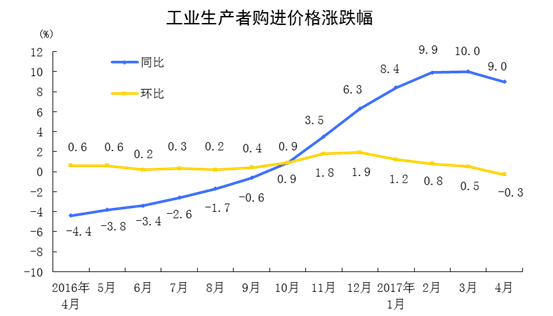 工业生产者购进价格中,燃料动力类价格同比上涨17.6%,黑色金属材料类价格上涨17.3%,有色金属材料及电线类价格上涨15.4%,化工原料类价格上涨8.1%。