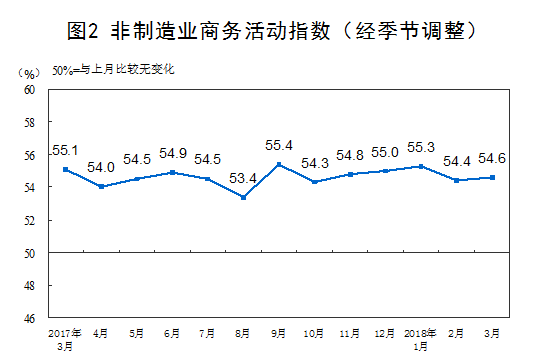 2018年3月份,中国非制造业商务活动指数为54.6%,比上月上升0.2个百分点,非制造业总体延续平稳较快的运行格局。