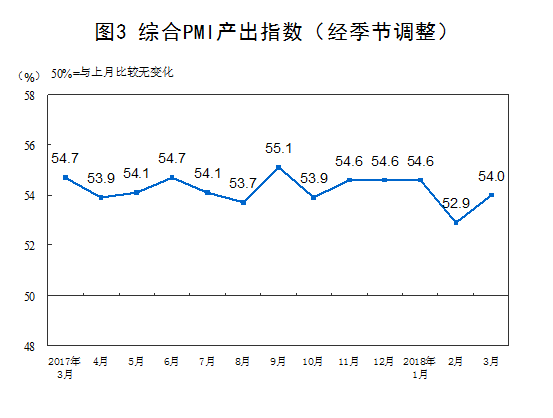 2018年3月份,中国综合PMI产出指数为54.0%,比上月上升1.1个百分点,继续高于临界点,表明我国企业生产经营活动总体呈现加速扩张的发展态势。