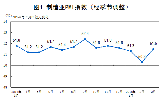 2018年3月份,中国制造业采购经理指数(PMI)为51.5%,比上月上升1.2个百分点,制造业呈现稳中有升的发展态势。