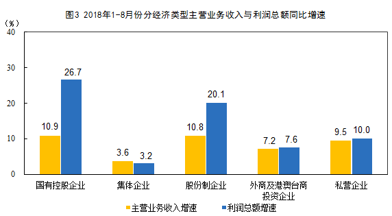 1-8月份,规模以上工业企业中,国有控股企业实现利润总额13473亿元,同比增长26.7%;集体企业实现利润总额139.2亿元,增长3.2%;股份制企业实现利润总额31323.9亿元,增长20.1%;外商及港澳台商投资企业实现利润总额10906.4亿元,增长7.6%;私营企业实现利润总额11485.6亿元,增长10%。