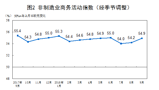 2018年9月份,中国非制造业商务活动指数为54.9%,比上月上升0.7个百分点,表明非制造业总体继续保持稳中向好的发展势头。