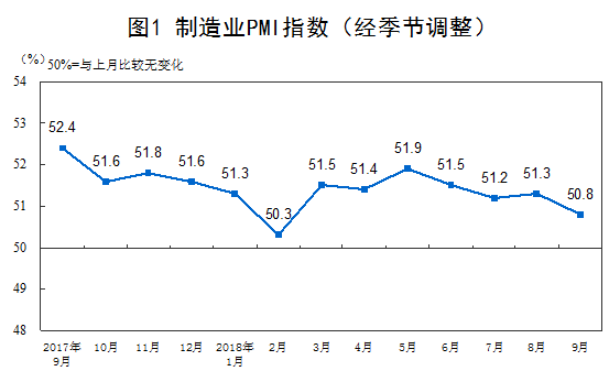 2018年9月份,中国制造业采购经理指数(PMI)为50.8%,比上月回落0.5个百分点,继续运行在景气区间,制造业总体延续扩张态势,增速有所放缓。