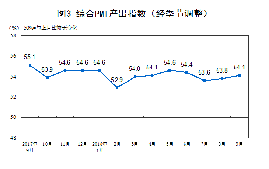 2018年9月份,综合PMI产出指数为54.1%,高于上月0.3个百分点,表明我国企业生产经营活动总体保持平稳。