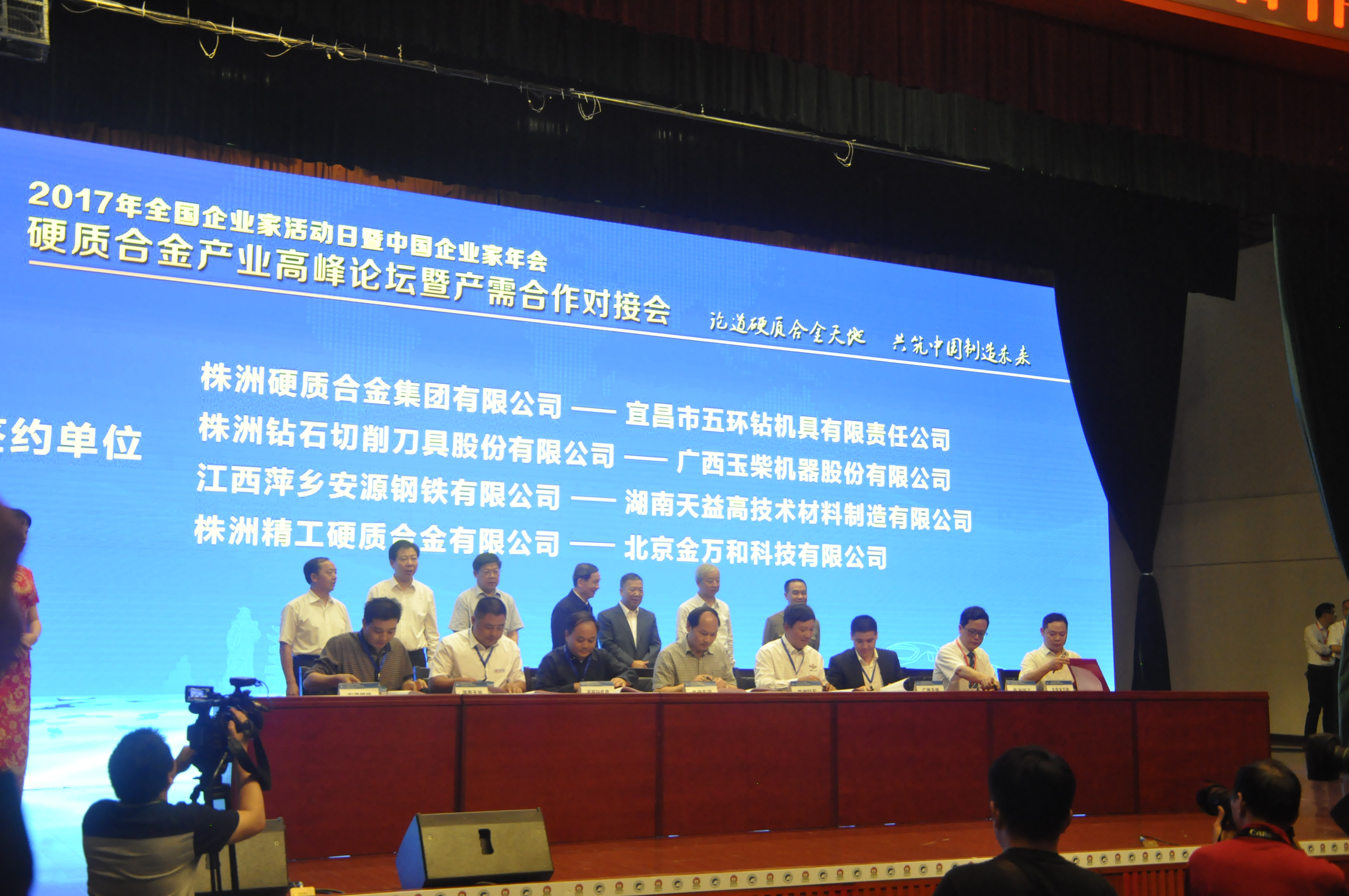 在随后举行的硬质合金产需签约仪式上,中钨高新材料股份有限公司、株洲硬质合金集团有限公司、阳泉煤业集团华越机械有限责任公司等29家生产和应用企业在现场签订了17份产需协议,涉及战略规划、商贸合作、产品流通各环节,价值超10亿元。