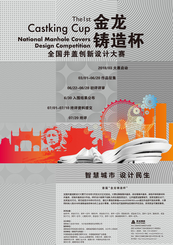 首届“金龙铸造杯”全国井盖创新设计大赛是在湖南省经信委等指导监督下,由湖南省工业设计协会和长沙金龙铸造实业有限公司联合主办,以城市井盖产品为对象的专项创意设计竞赛。本次大赛呼吁设计者一起关注城市建设,以井盖的创新设计为指引,弘扬全民创新精神,为民生服务而设计,为城市的公共生活而设计,将互联网+、绿色制造、文化艺术等与之结合,创造更为完美的井盖及相关配套产品。大赛同时纳入到2018年湖南省政府举办的工业设计赛事,优秀作品可直接参加后续的评优活动,奖项奖金可兼获兼得。