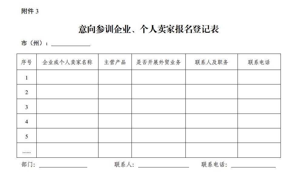 1、各市州、县市区商务、工业和信息化主管部门要充分发挥各行业商(协)会作用,全面梳理本地品牌企业、传统制造及商贸流通企业、外贸企业、重点产业带及专业市场(园区)企业,积极引导鼓励企业参加跨境电商培训。各市州商务、工业和信息化主管部门负责汇总当地意向参训企业、个人卖家名单,于
