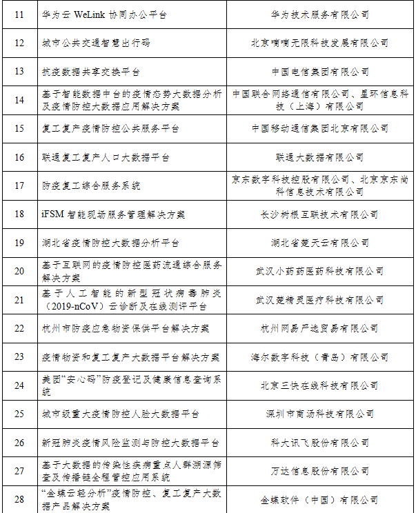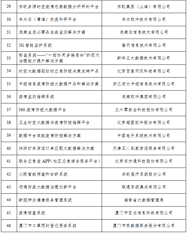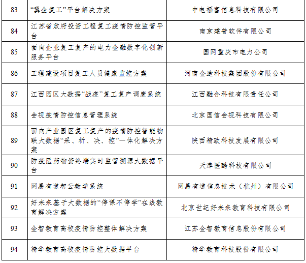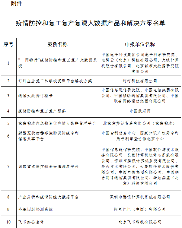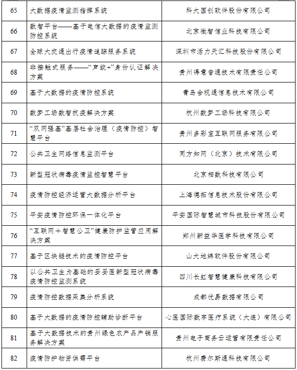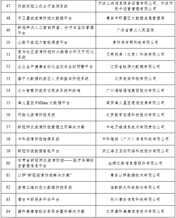 根据《工业和信息化部办公厅关于组织开展支撑疫情防控和复工复产复课大数据产品和解决方案征集工作的通知》(工信厅信发函〔2020〕31号)要求,经各单位推荐、专家组评审、网上公示等环节,现将“‘一网畅行’疫情防控和复工复产大数据系统”等94个疫情防控和复工复产复课大数据产品和解决方案予以公布。