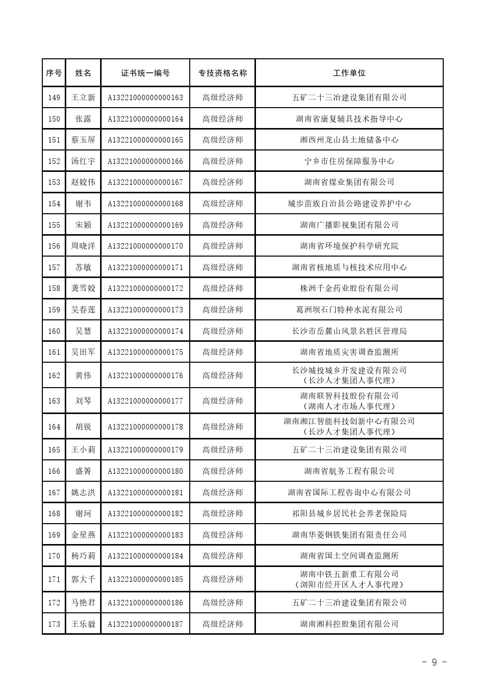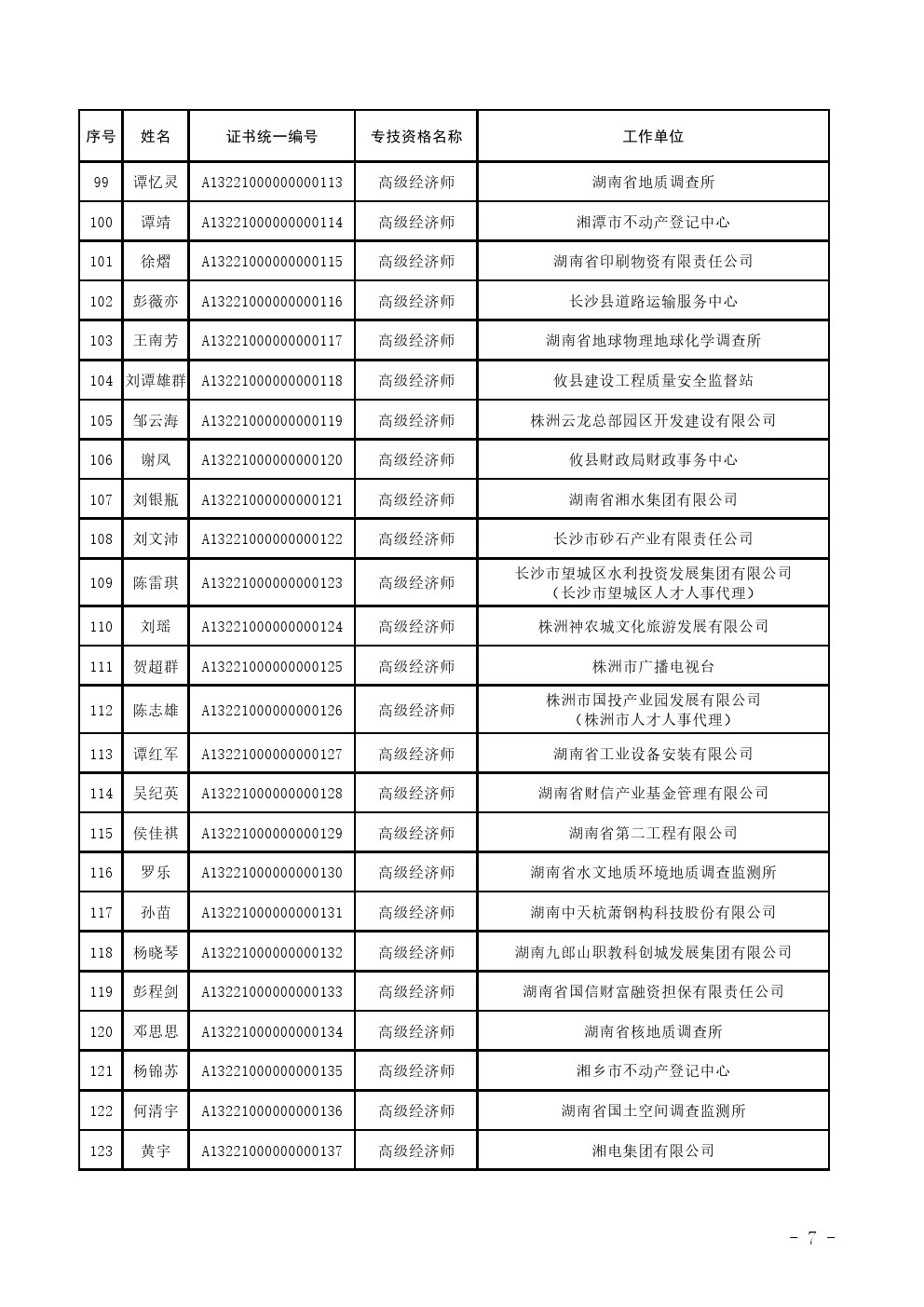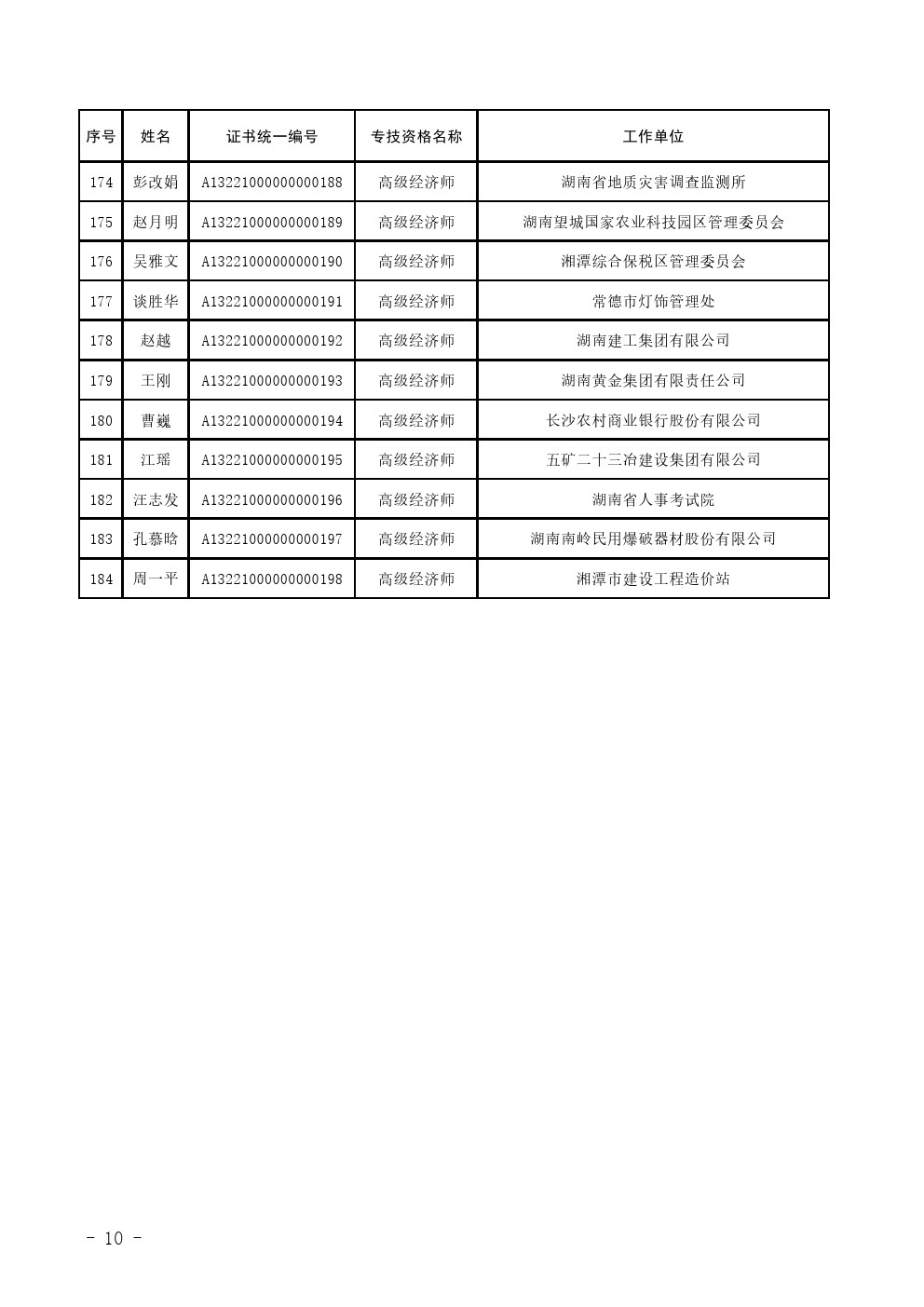 经省经济系列高级专业技术职称评审委员会2022年11月5日评审通过,并经省职称改革工作领导小组备案(湘人社职称〔2023〕8号),同意确认张新华等184名同志经济系列高级专业技术职称(名单附后),其职称确认时间为2022年11月11日。备案结果在湖南省人力资源和社会保障厅门户网站-办事大厅-湖南省高级职称证书查询系统提供公共查询(该网址正在更新中,预计3月初正常查询)。本人可通过“智慧人社”公众号查询并打印高级职称电子证书。