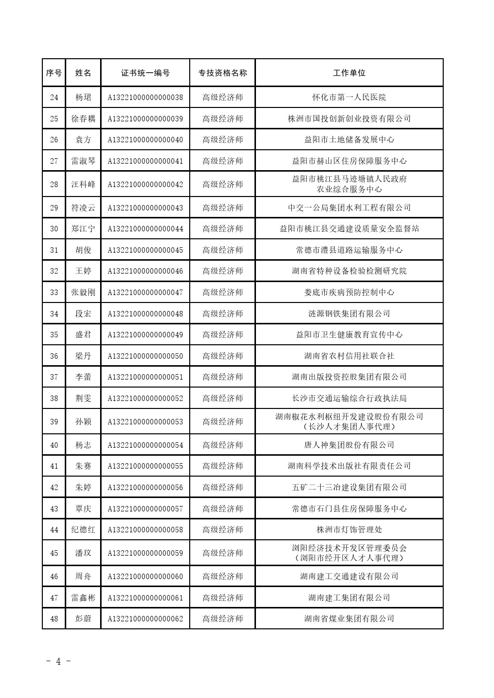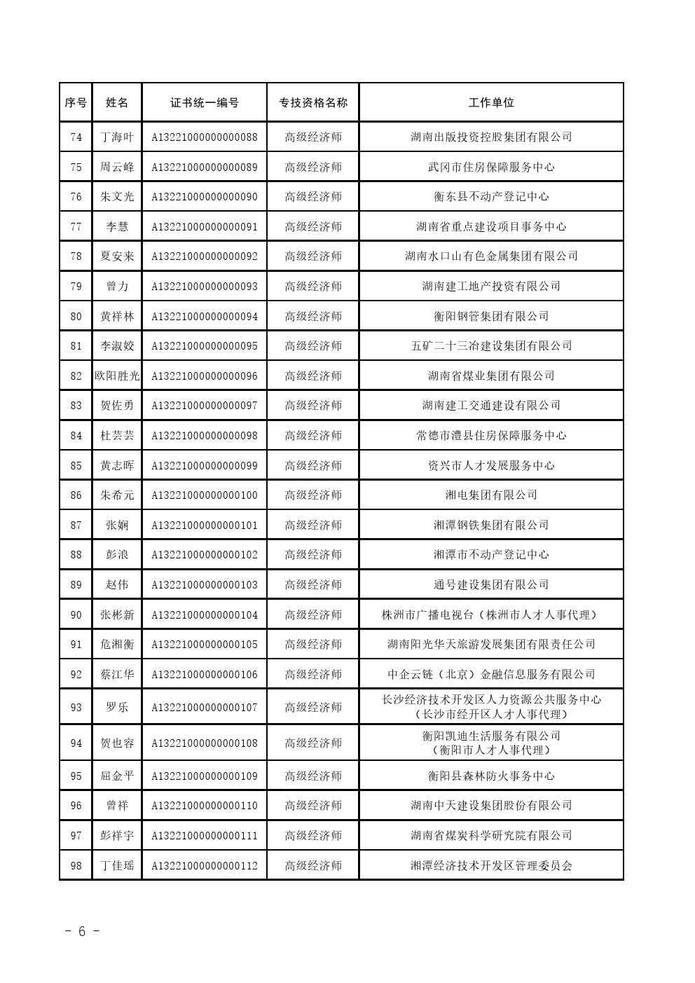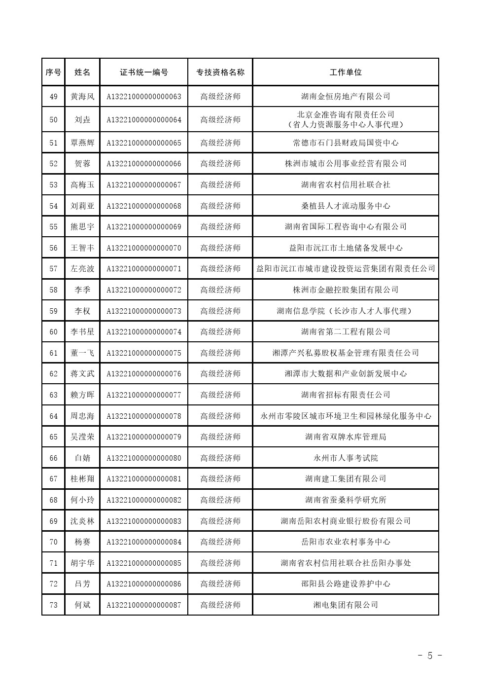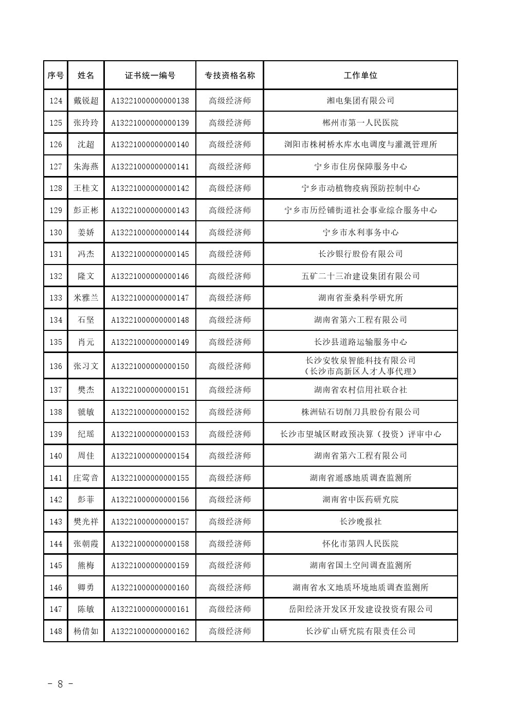 经省经济系列高级专业技术职称评审委员会2022年11月5日评审通过,并经省职称改革工作领导小组备案(湘人社职称〔2023〕8号),同意确认张新华等184名同志经济系列高级专业技术职称(名单附后),其职称确认时间为2022年11月11日。备案结果在湖南省人力资源和社会保障厅门户网站-办事大厅-湖南省高级职称证书查询系统提供公共查询(该网址正在更新中,预计3月初正常查询)。本人可通过“智慧人社”公众号查询并打印高级职称电子证书。