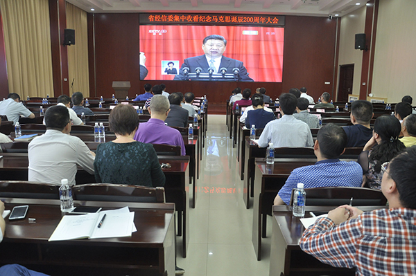 5月4日,省经信委组织集中收看纪念马克思诞辰200周年大会实况直播,认真聆听习近平总书记重要讲话。全体在家委领导、委机关全体干部参加,委属各单位自行集中组织收看。