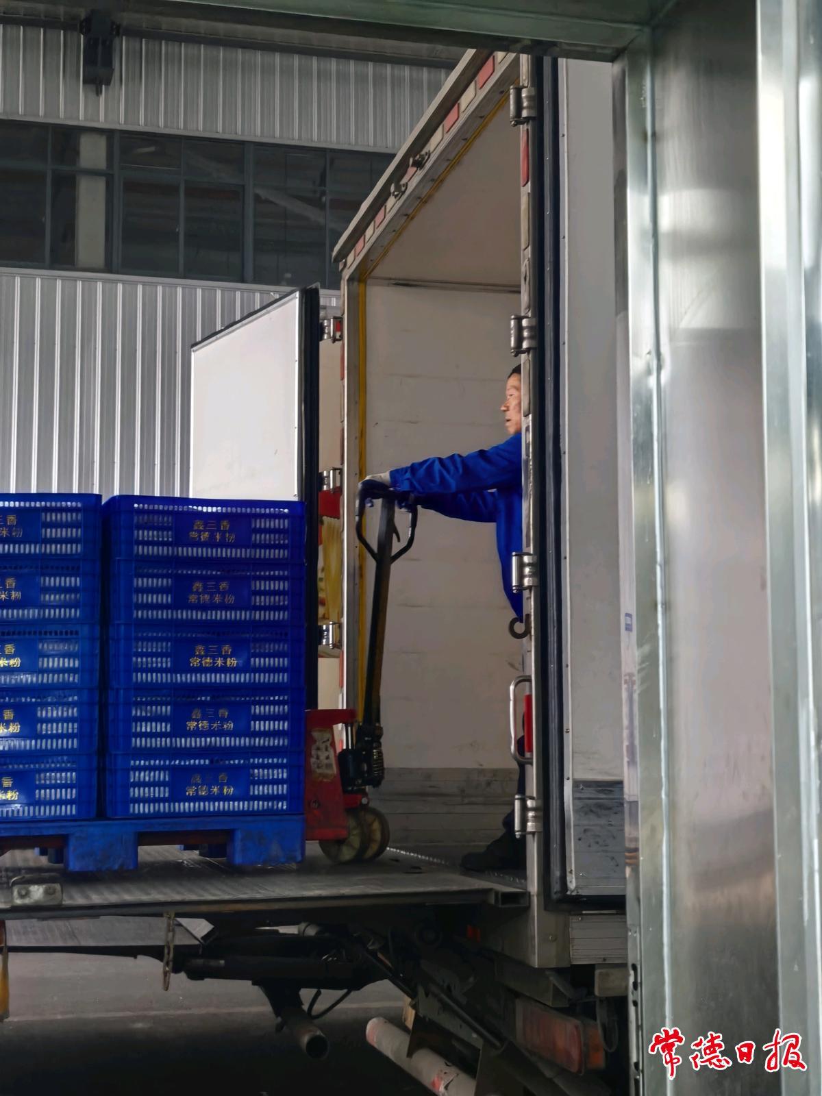 2月23日一大早,记者走进湖南鑫三香常德米粉集团有限公司。在生产车间,记者看到一条条生产线正全速运转,如白色瀑布般的米浆在自动化设备上经历蒸制、冷却、切条,最终变成一根根洁白光润的鲜湿米粉。身着统一工装的工人,在流水线旁熟练地进行分拣、称重、装袋、封口、装箱,动作流畅而迅捷。一箱箱打包好的米粉快速装进冷链车,然后发往全市各个市场与门店。