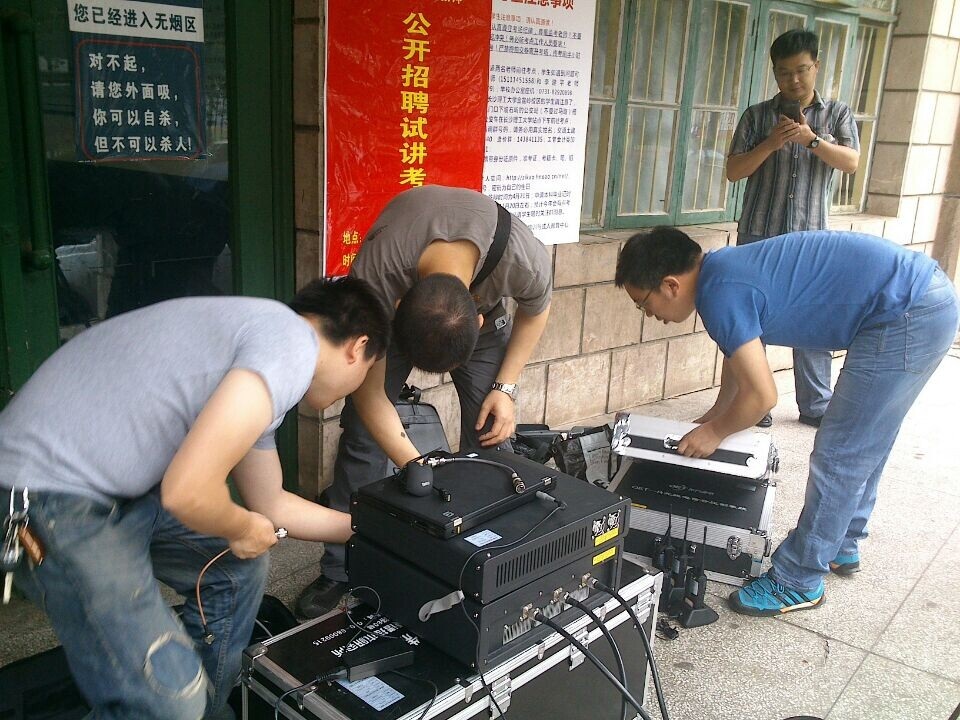 在湖南建筑高级技工学校考场,5月24日上午,考试进行到1个半小时后,移动监测车监测到多个频点上传来报答案的作弊声音。巡考小组迅速分别利用监测车和监测设备对信号进行定位。由于学校地形十分复杂,测向定位非常困难,加上有人放风,上午技术人员未能将信号源找到,只能进行压制。下午技术人员事先登上校内住宿区楼顶守候,作弊信号出现后进行测向定位,再派人步行到信号源所在范围内巡查,发现一个可疑人员不停地张望。对可疑楼道进行搜查,未发现作弊设备。经扩大搜查范围,在楼顶天台上发现一个背包,内有作弊对讲机2台。