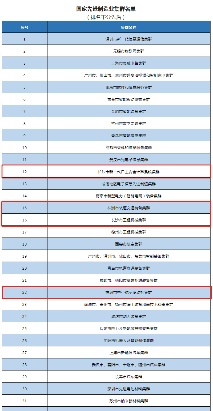 湖南入选“国家队”的产业集群分别是:长沙市新一代自主安全计算系统集群、长沙市工程机械集群、株洲市轨道交通装备集群、株洲市中小航空发动机集群。