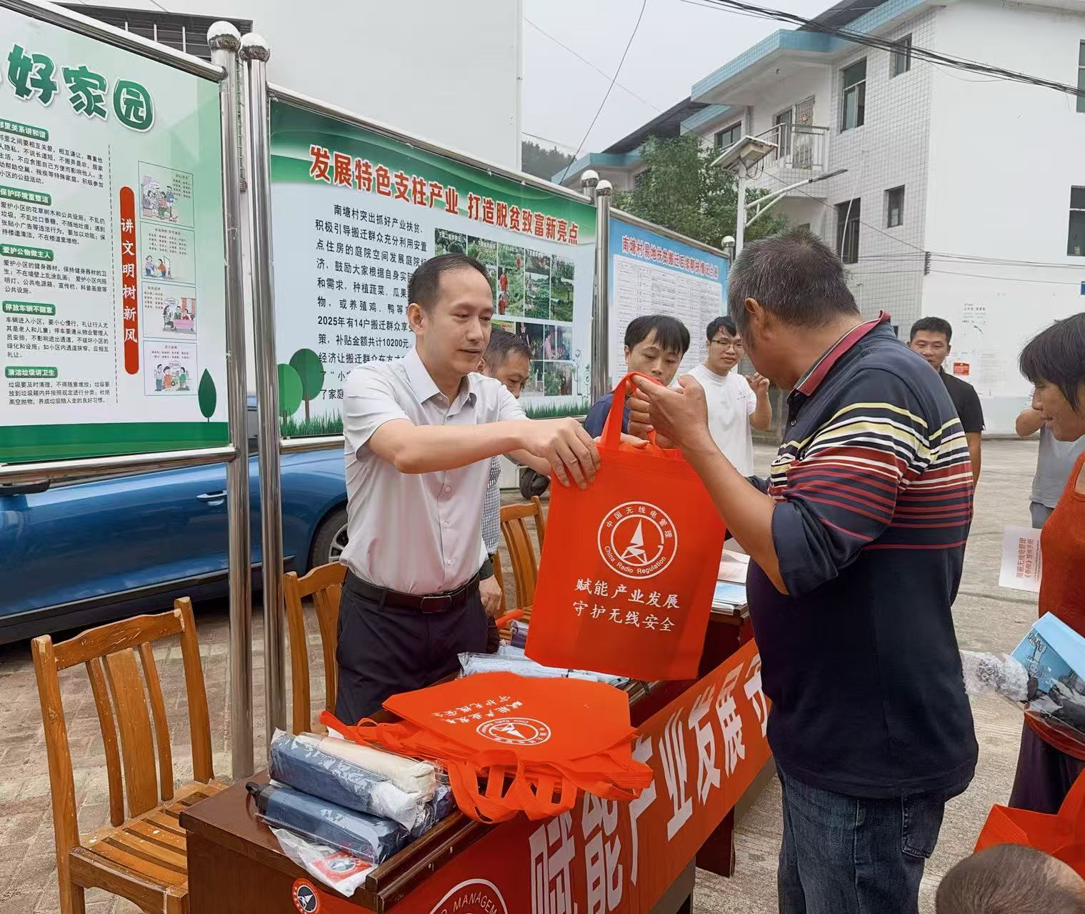 2025年10月16日,郴州市工信局围绕“赋能产业发展,守护无线安全”主题,在永兴县湘阴渡街道南塘村开展无线电宣传进乡村活动,将无线电科普知识和反诈服务送到村民身边。市工信局党组成员、副局长邓先军参加活动。