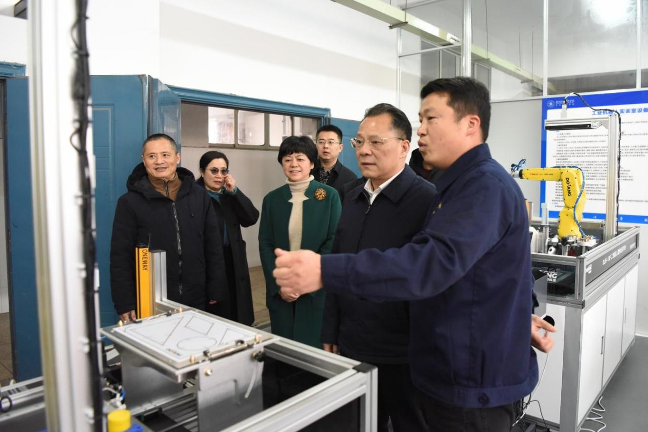 慰问组一行深入学校数控专业实训车间和工业机器人实训车间,徐麟老师现场介绍了车间最新升级、精准对接企业需求的实训设备。李建华部长认真察看设备配置与教学应用情况,对学校紧扣产业发展、高标准建设实训教学体系的举措予以高度评价,充分肯定学校过硬的技能教育水平和与时代接轨的实训设备建设成果。